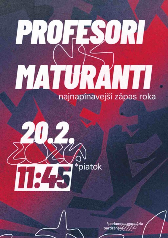 Už mnoho rokov sa na zimnom štadióne koná stretnutie, ktoré je jedinečné: maturanti Gymnázia Partizánske skrížia hokejky s profesormi. Rovnako tomu bude aj v piatok 20. februára. Krátko pred poludním nastúpia žiaci maturitných tried proti učiteľom (už niekoľko rokov podporovaní niekoľkými rodičmi).