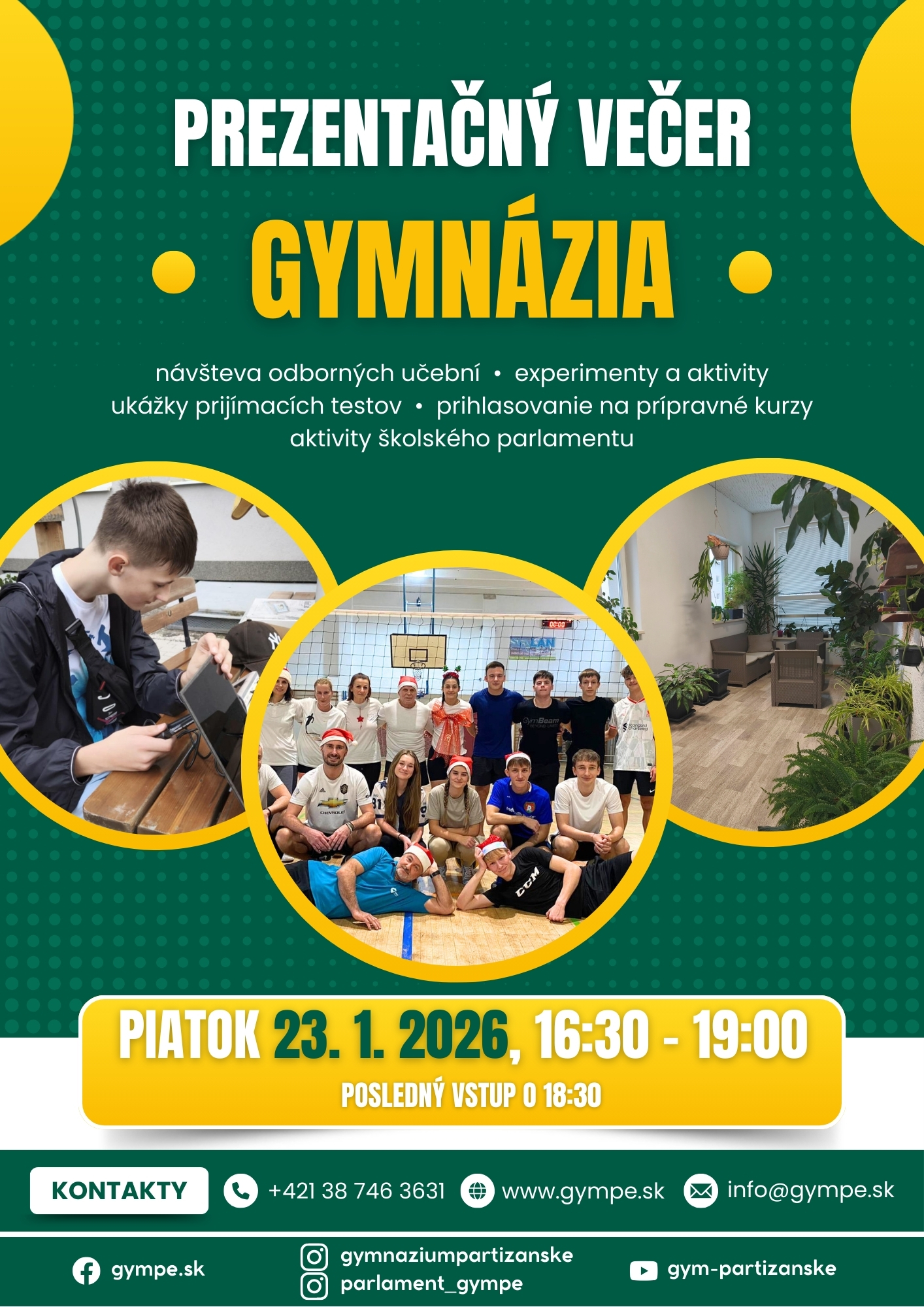 Gymnázium Partizánske opäť otvára svoje dvere. Pozývame vás na ďalší PREZENTAČNÝ VEČER GYMNÁZIA. V piatok 23. januára popoludní môžete nazrieť do našich priestorov. Naši žiaci pod vedením učiteľov pripravujú pre návštevníkov rôzne experimenty a aktivity, k dispozícii budú ukážky prijímacích testov, Žiacky parlament predstaví svoje mimoškolské aktivity.